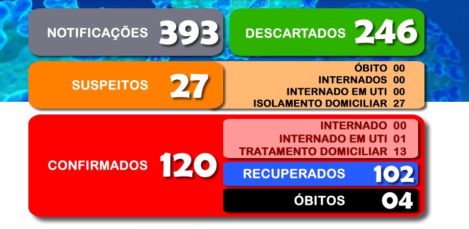 04 CASOS CONFIRMADOS (que vieram a óbito), 13 CASOS CONFIRMADOS (em tratamento domiciliar), 01 CASO CONFIRMADO (internado em UTI) e 102 CASOS CONFIRMADOS RECUPERADOS.